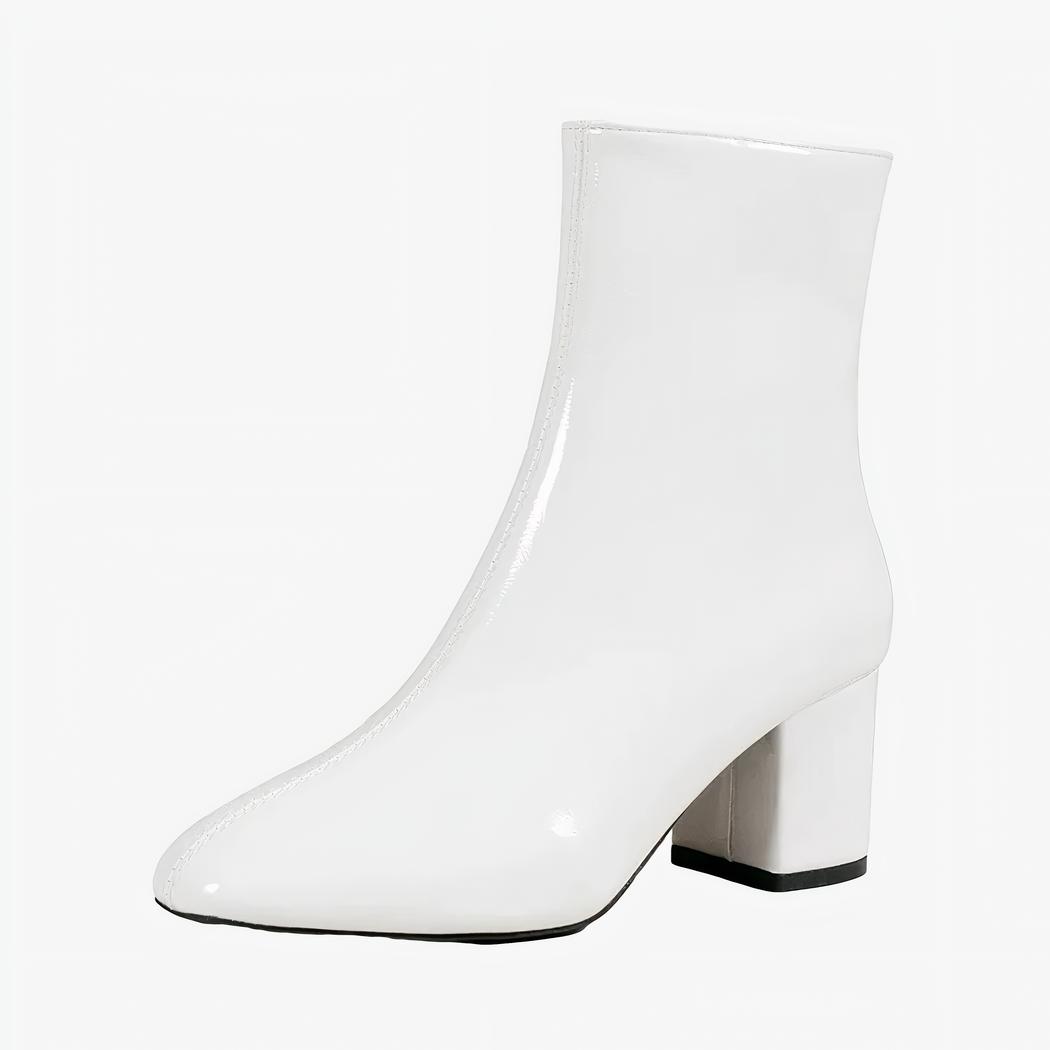 Découvrez le raffinement moderne avec ces bottes à talon blanches. Leur surface lisse en simili cuir souligne un look contemporain, tandis que la fermeture éclair garantit une facilité d'enfilage remarquable. Le talon élégant prolonge la ligne de la jambe, offrant une allure gracieuse et puissante, parfaite pour les environnements professionnels ou les soirées chics.